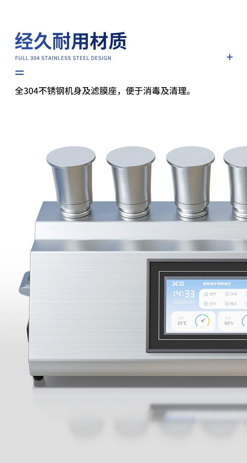 聚创智能六联微生物限度仪JC-WX600C基于薄膜过滤法的原理,与微生物培养器(M50)配套使用,通过液泵的抽滤作用,在系统内部形成负压,供试品在压差作用下被过滤,可能存在的微生物被滤膜截留,通过冲洗滤膜(如有必要),除去抑菌成分,然后反浇培养基进行培养,已检验供试品含菌量。主要用于各类水质、药品、食品等介质中微生物检测及实验室中进行除菌、除微粒等。具有操作过程不易受到污染、易于清洁等特点。