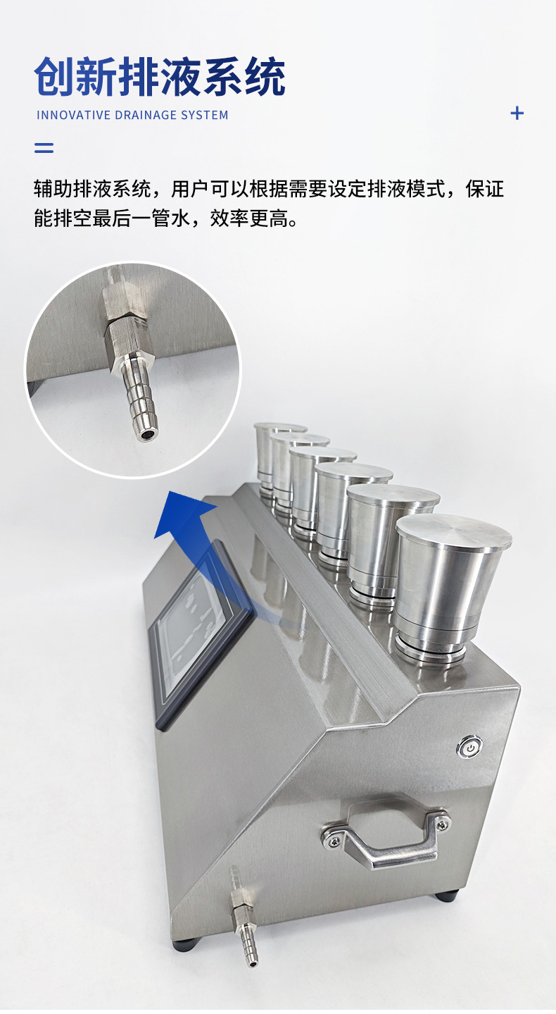 聚创智能六联微生物限度仪JC-WX600C基于薄膜过滤法的原理,与微生物培养器(M50)配套使用,通过液泵的抽滤作用,在系统内部形成负压,供试品在压差作用下被过滤,可能存在的微生物被滤膜截留,通过冲洗滤膜(如有必要),除去抑菌成分,然后反浇培养基进行培养,已检验供试品含菌量。主要用于各类水质、药品、食品等介质中微生物检测及实验室中进行除菌、除微粒等。具有操作过程不易受到污染、易于清洁等特点。