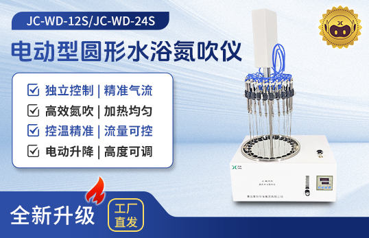 聚创JC-WD-12S/24S型电动型圆形水浴氮吹仪采用水浴恒温加热的方式,将氮气快速、连续、可控地吹入加热的样品表面从而将样品进行浓缩,这种方法省时、操作方便、容易控制。